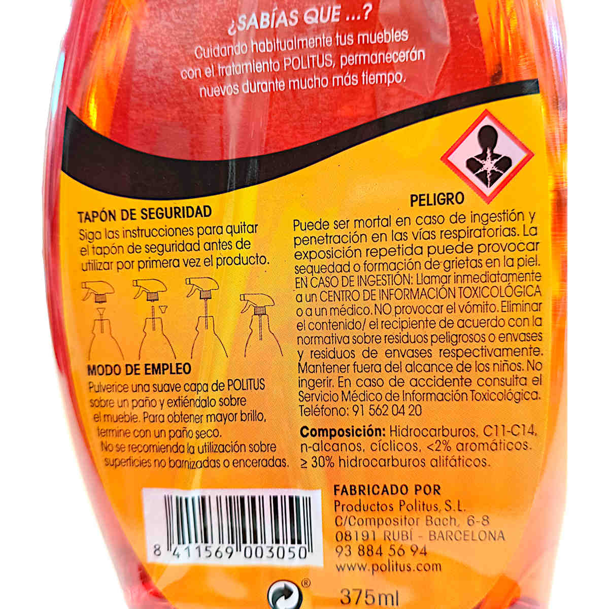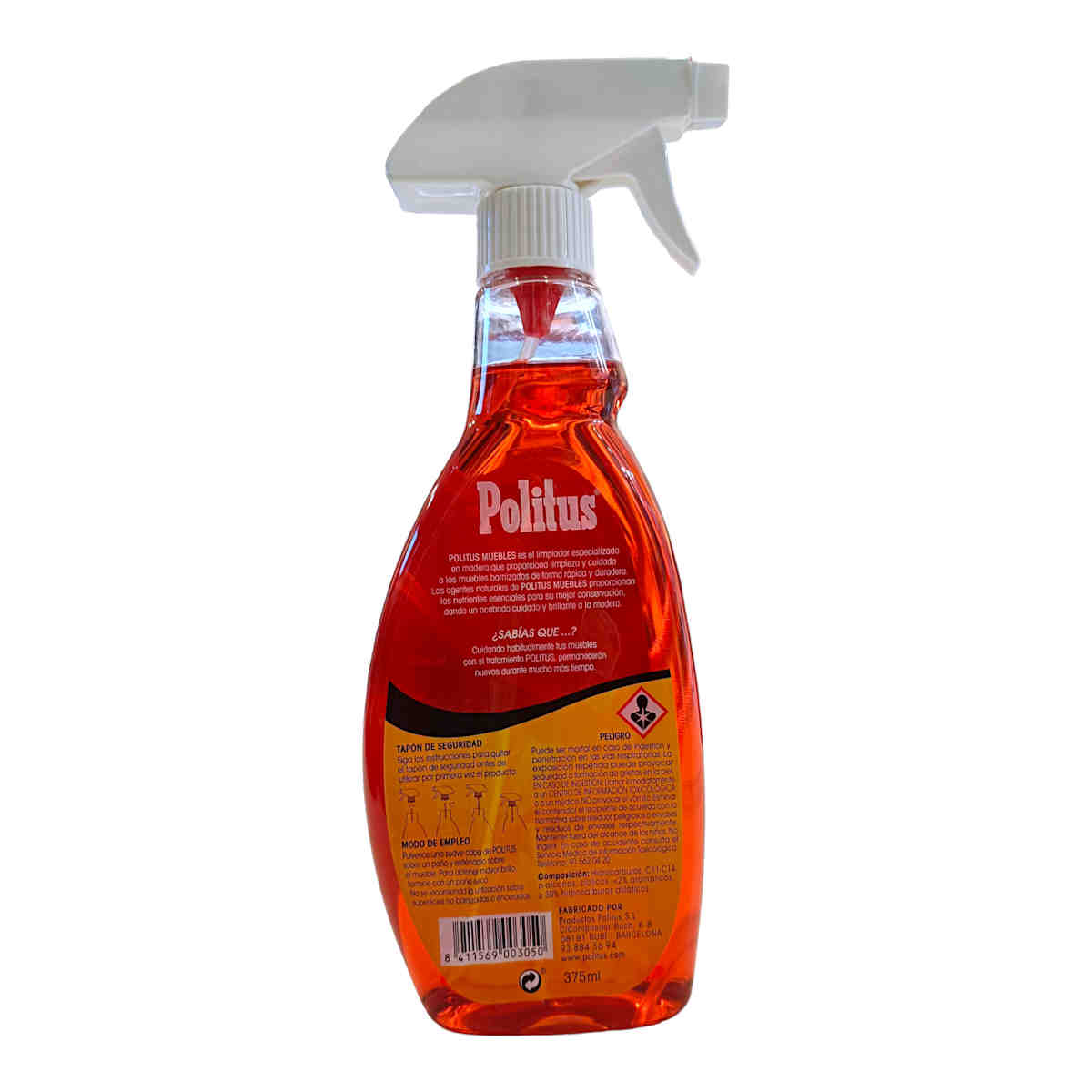 El limpiador de muebles Politus con pistola de 375ml es ideal para mantener tus muebles barnizados en perfectas condiciones. Este limpiador sin silicona ni olores, abrillanta y protege las superficies de polvo y manchas.