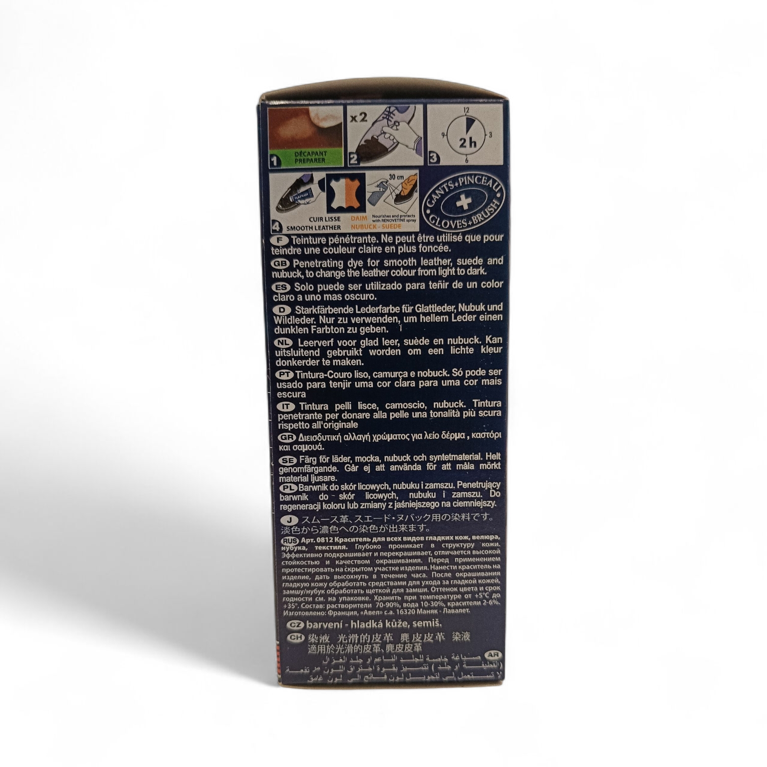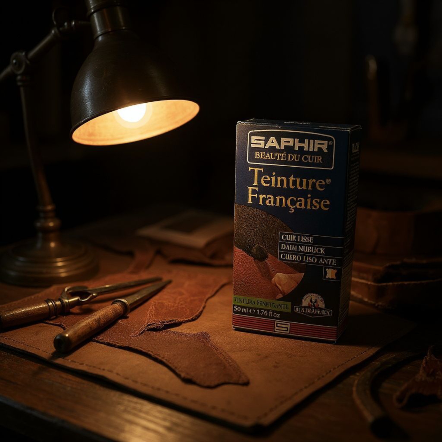 Tintura francesa Saphir, el clásico tinte premium para cuero liso, nubuck y ante. Disponible en negro, marrón oscuro y azul marino, con acabado intenso y duradero.
